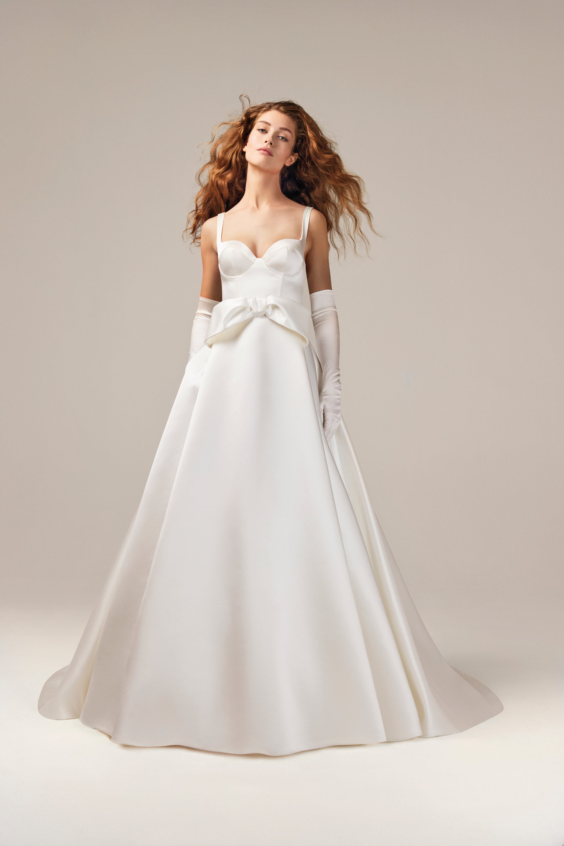 Abito in raso con corpetto corsaletto e fiocco grande sul davanti.