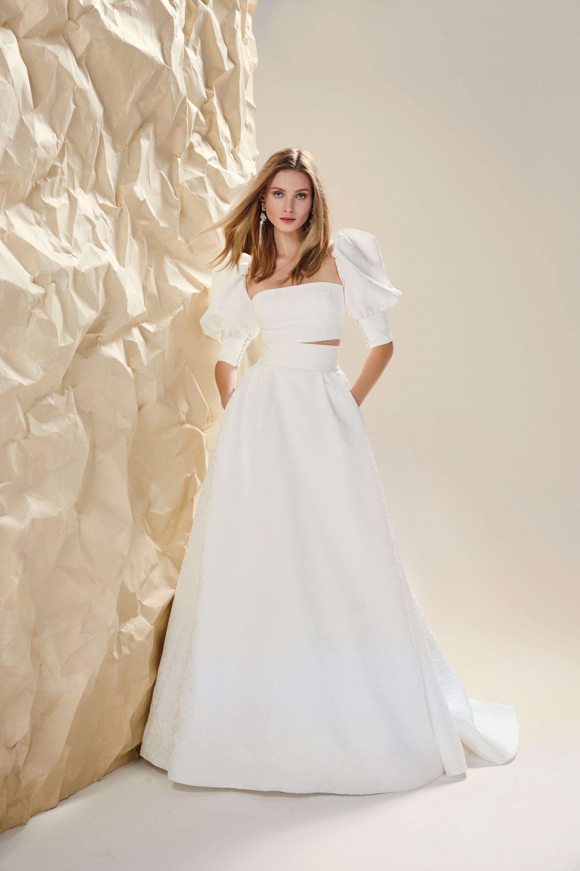 Due pezzi in broccato. Crop top con maniche a palloncino e gonna svasata.