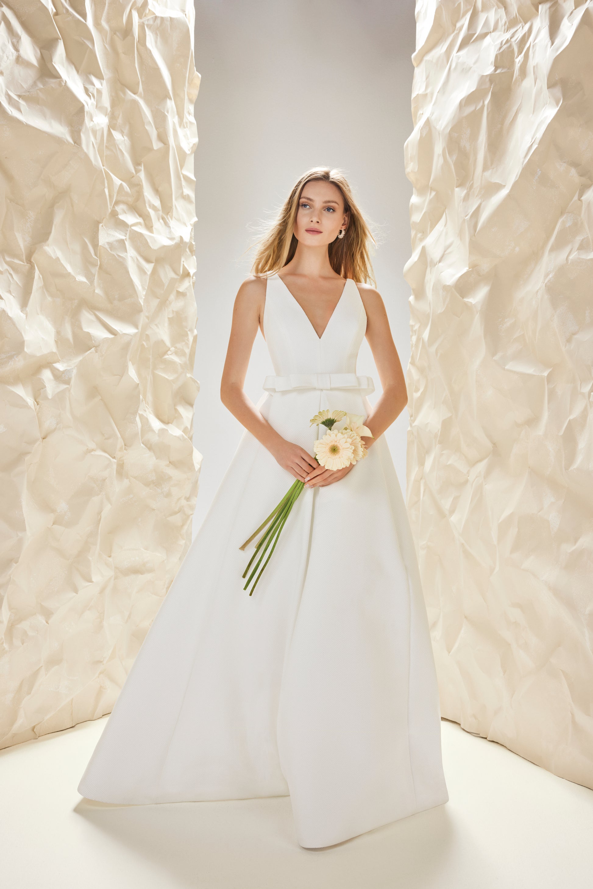 Silhouette evasé in gran piqué con scollatura a punta e fiocco sul punto vita.