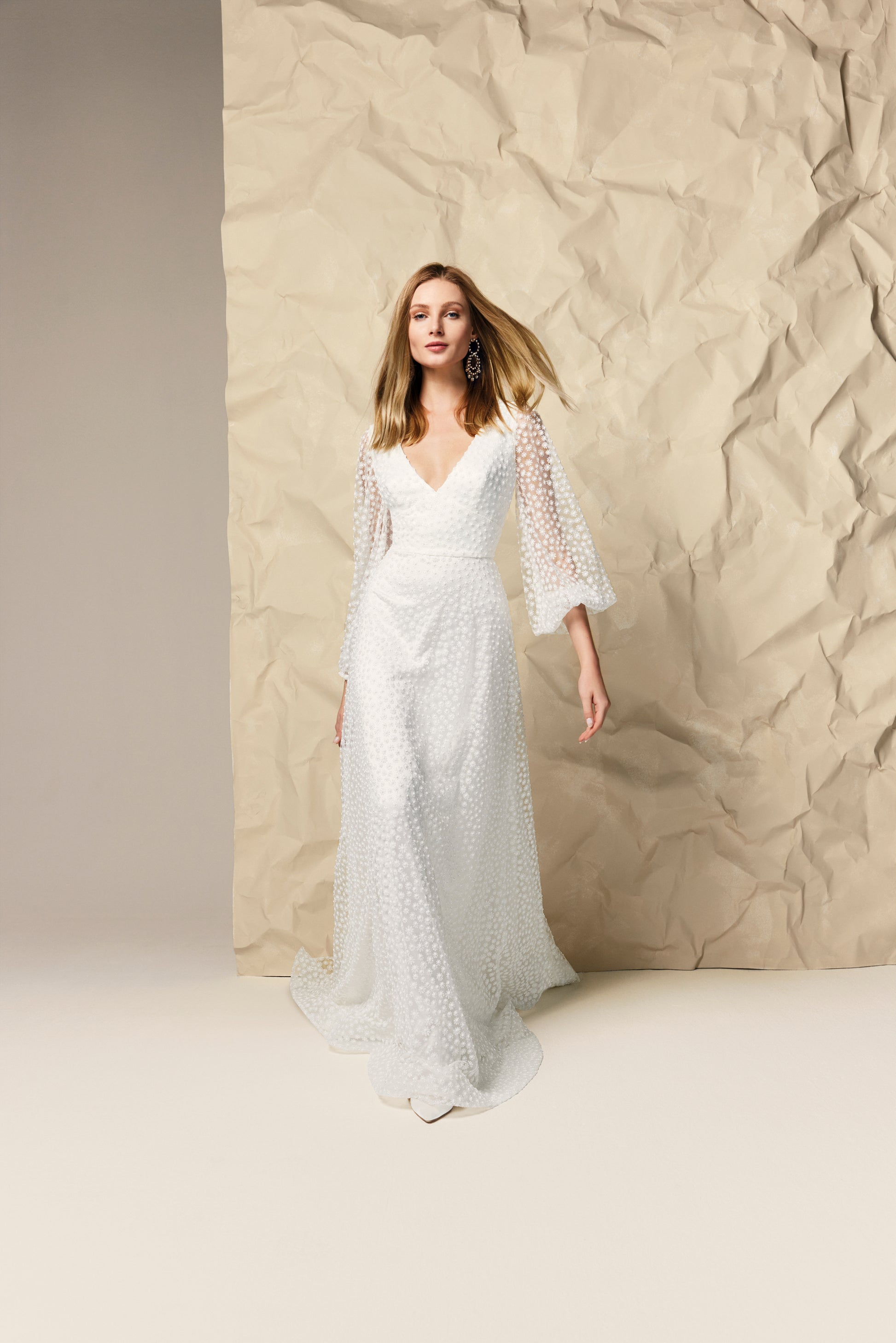 Abito morbido a fantasia di lustrini. Manica a sbuffo e scollature a V.