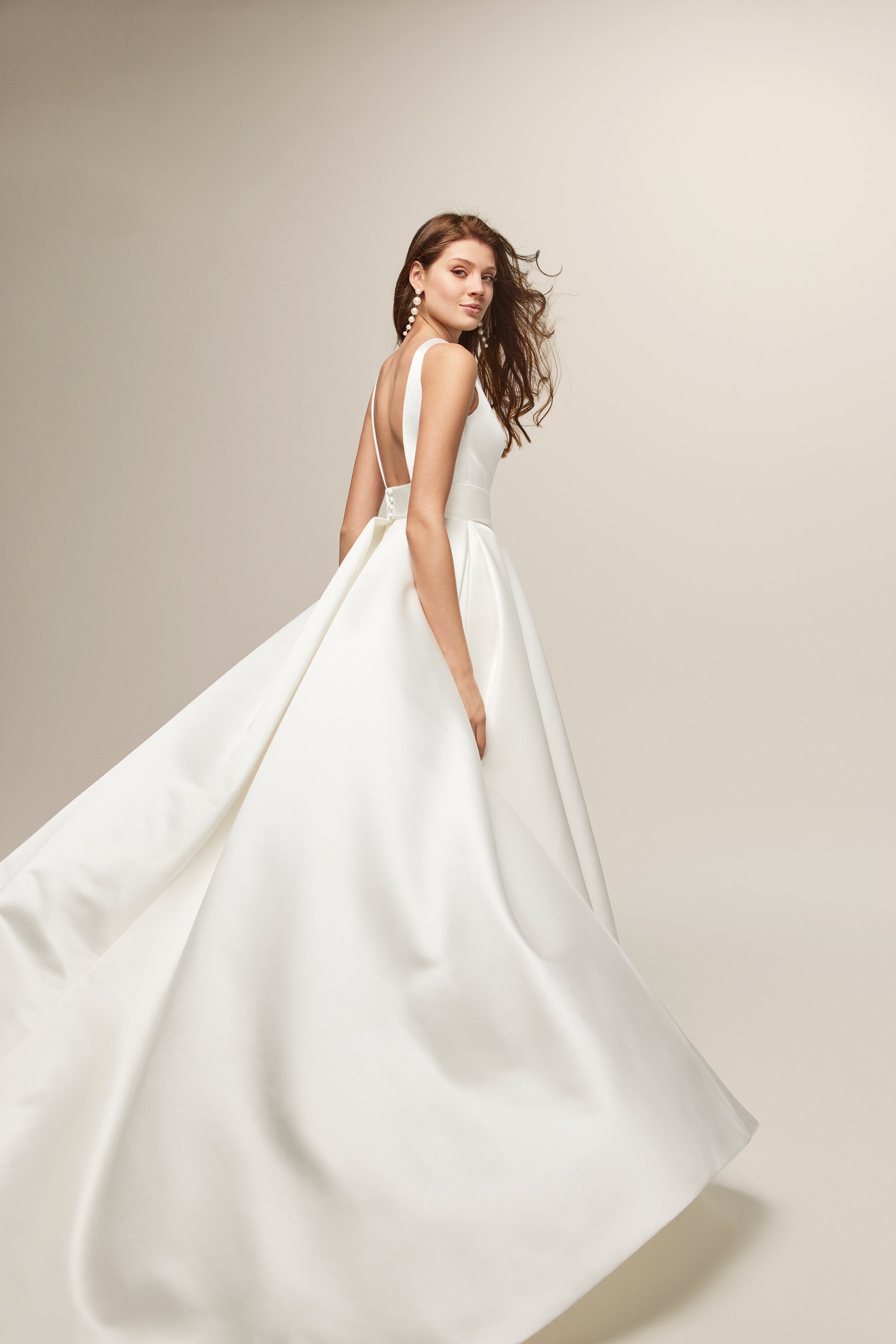 Silhouette svasata  in raso.  Gonna con pences in vita e scollo davanti e dietro.