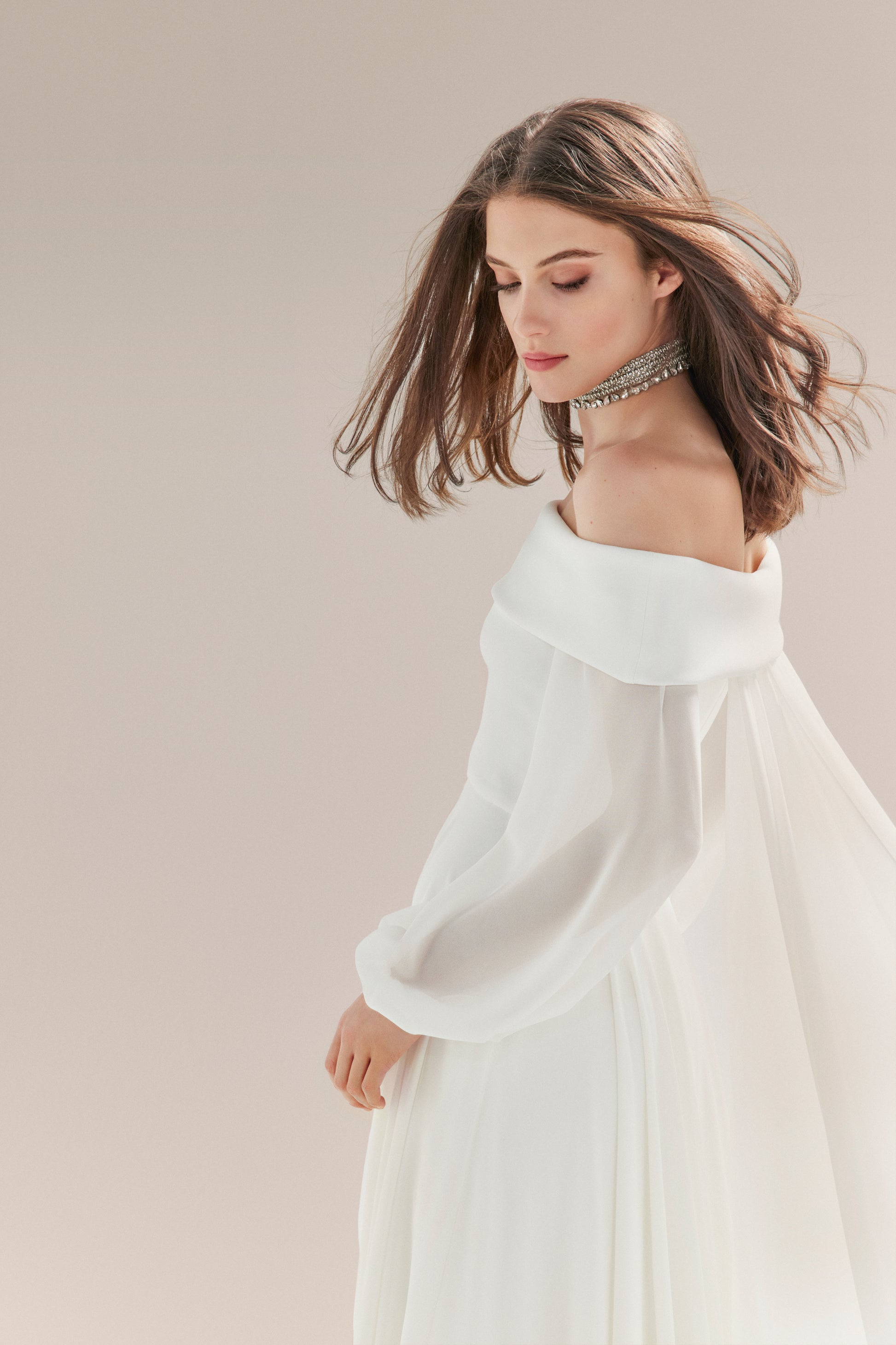 Abito svasato a vita alta, scollatura cutaway, maniche lunghe e mantellina applicata. Combinazione di crêpe e voile.