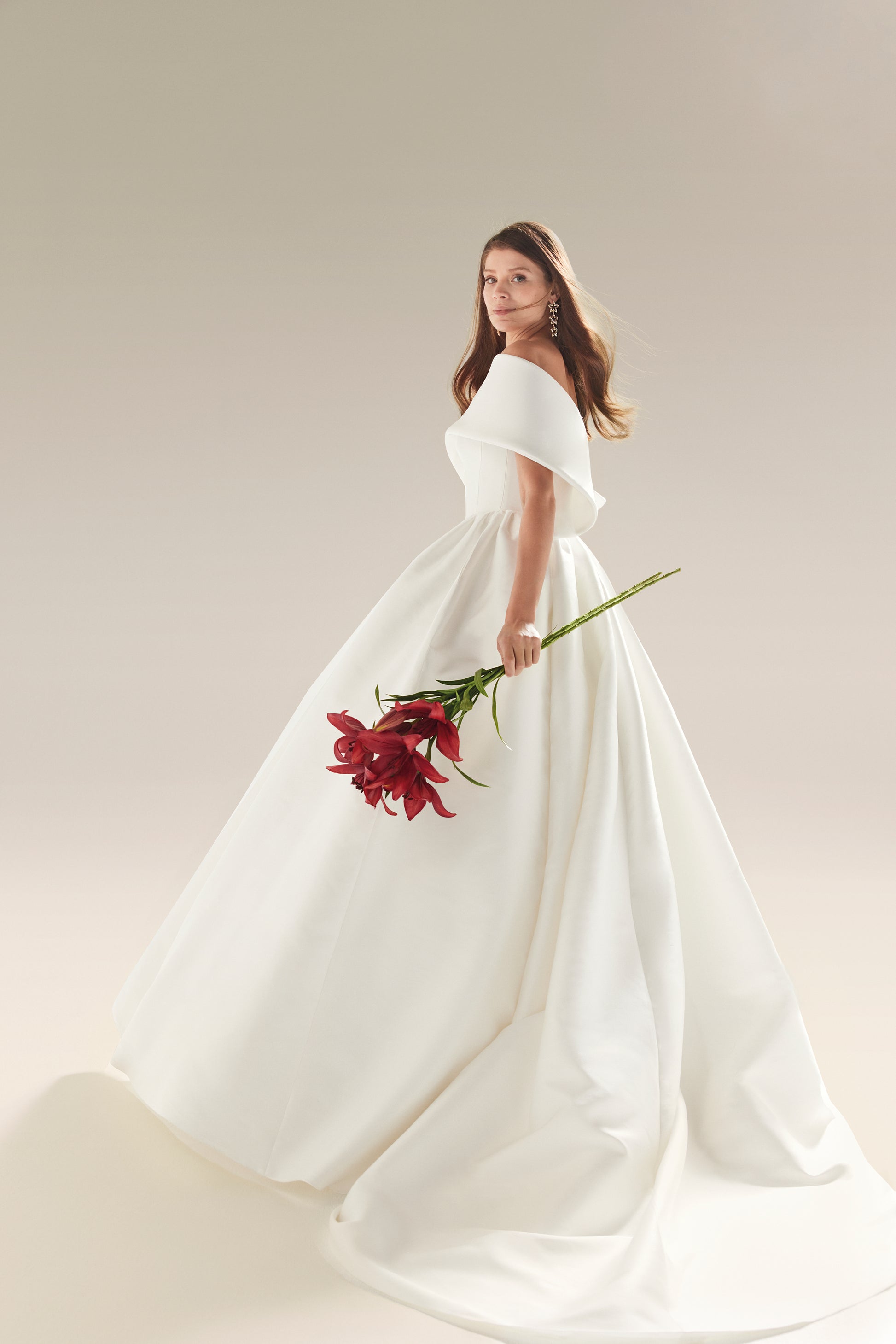 Abito molto vaporoso in mikado di seta con maxi fascia avvolgibile smontabile.