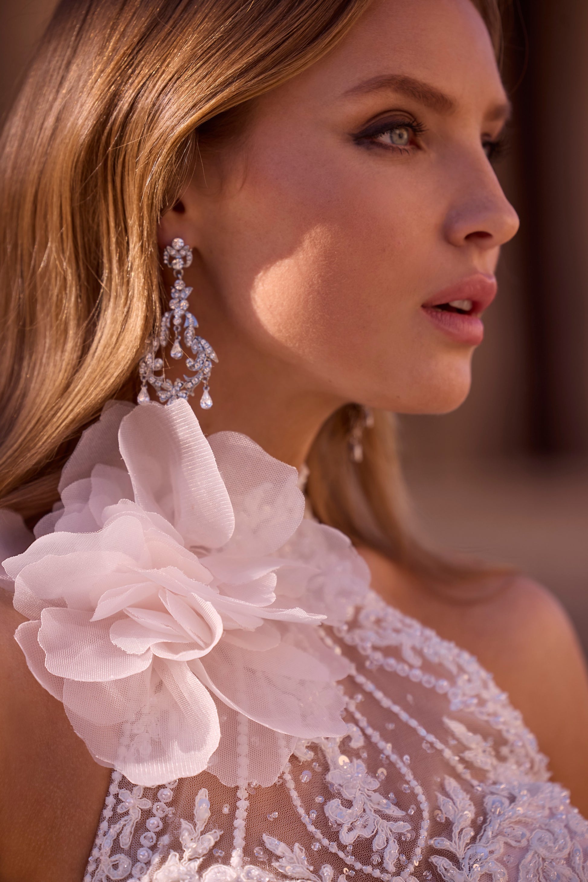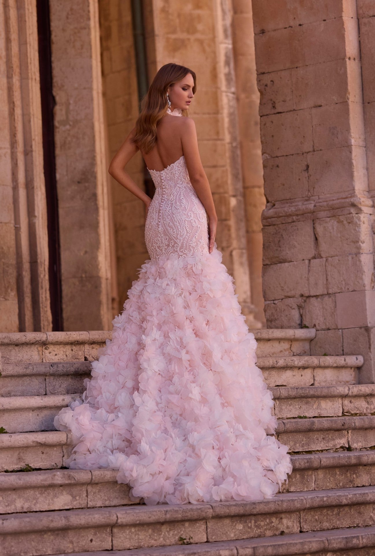 Un esclusivo abito da sposa a coda di pesce, caratterizzato da una gonna floreale 3D, scollo all'americana in pizzo e completo di motivo floreale 3D abbinato.