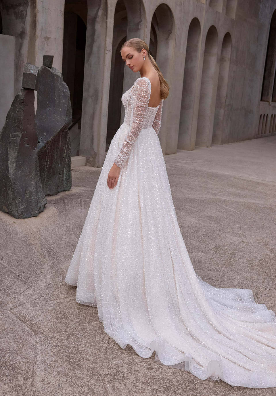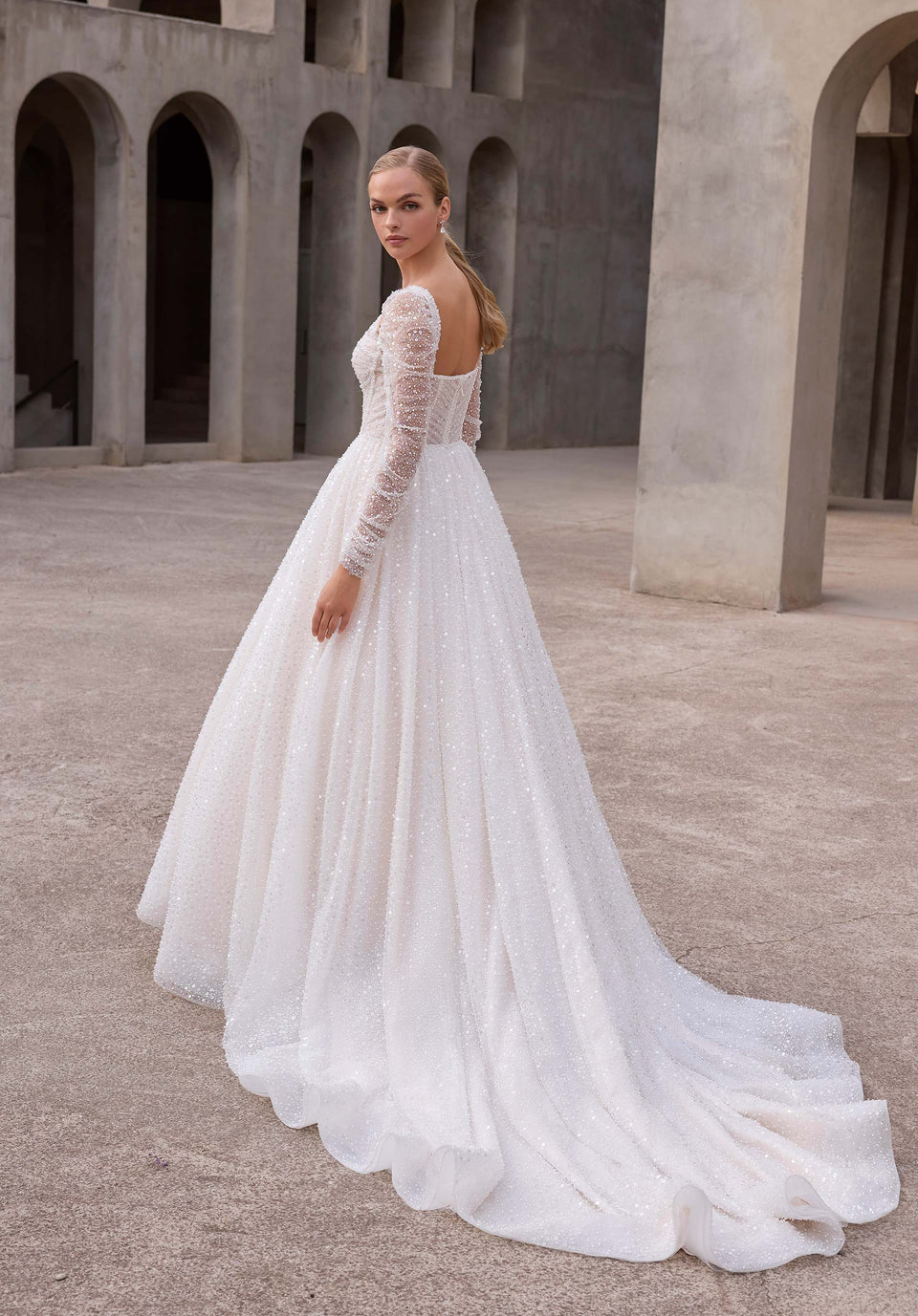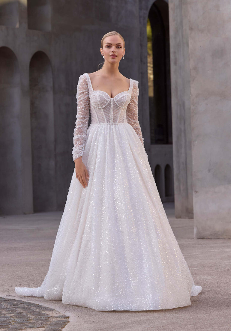 L'abito da sposa a trapezio presenta una scollatura a cuore su un corpetto stilizzato con stecche e maniche lunghe staccabili con volant su tulle ricamato di perle. Abito da sposa disponibile senza maniche