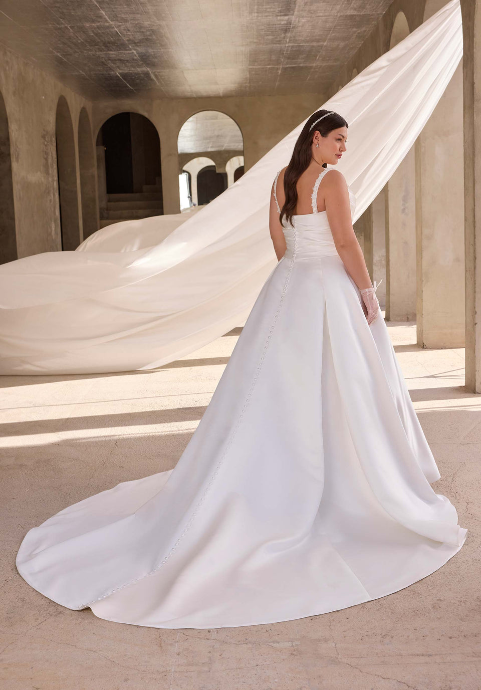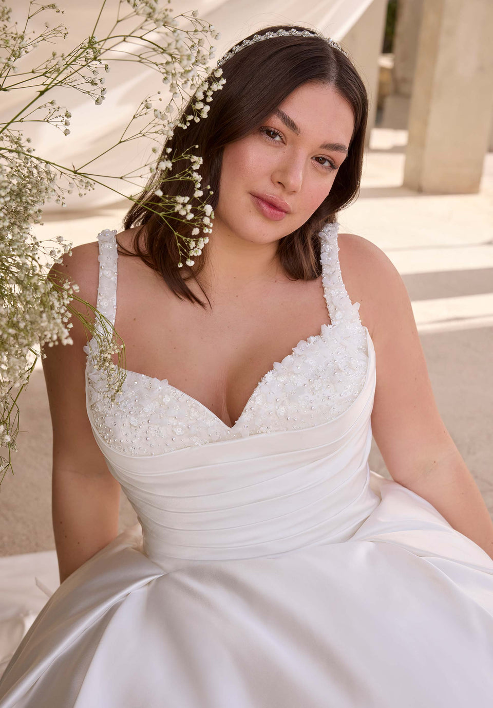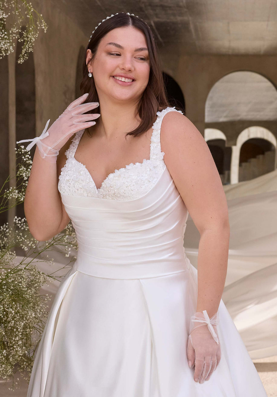 L'abito da sposa in raso duchessa ha una scollatura a cuore con perline stilizzate e spalline su un corpetto drappeggiato con vita scesa.