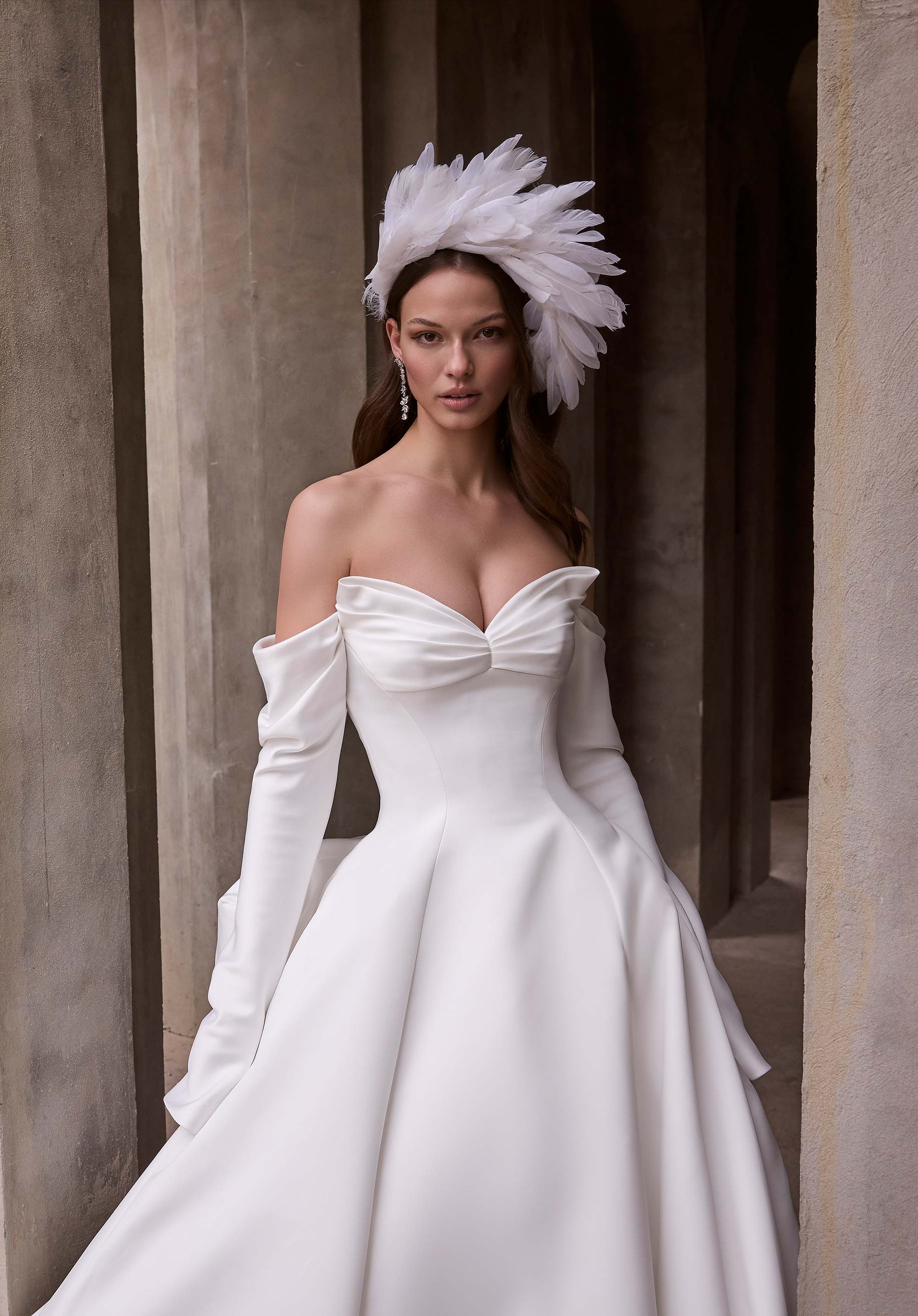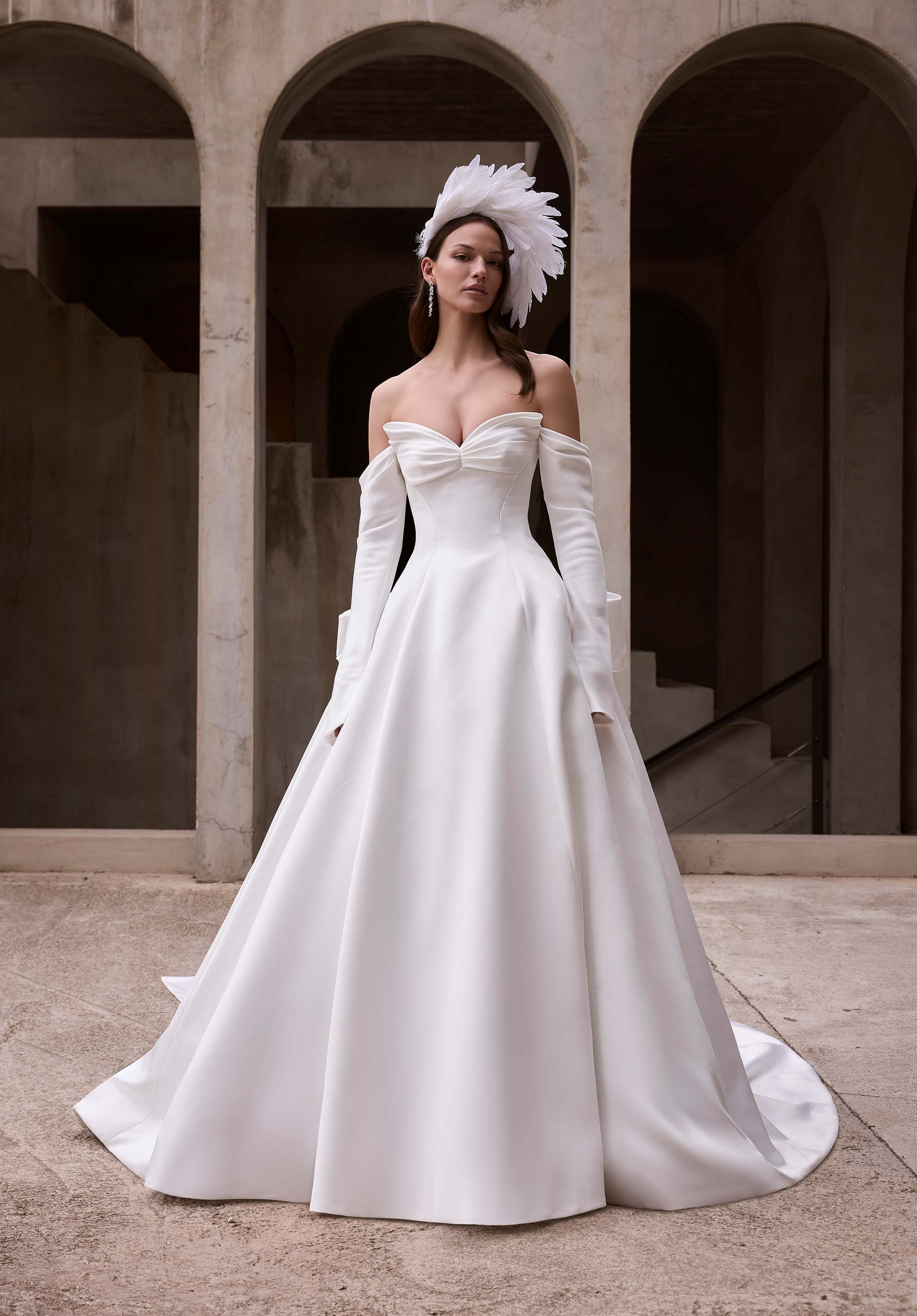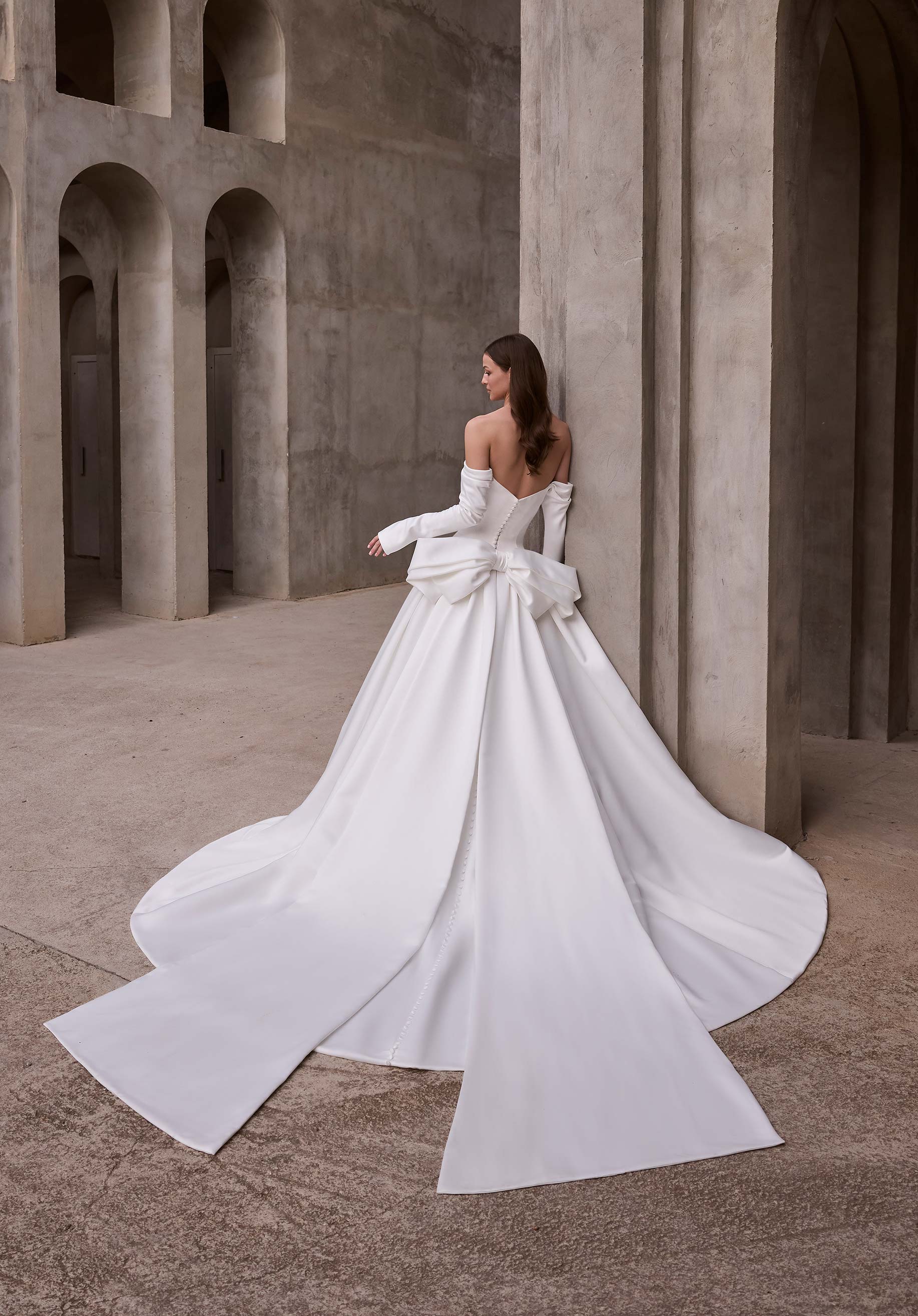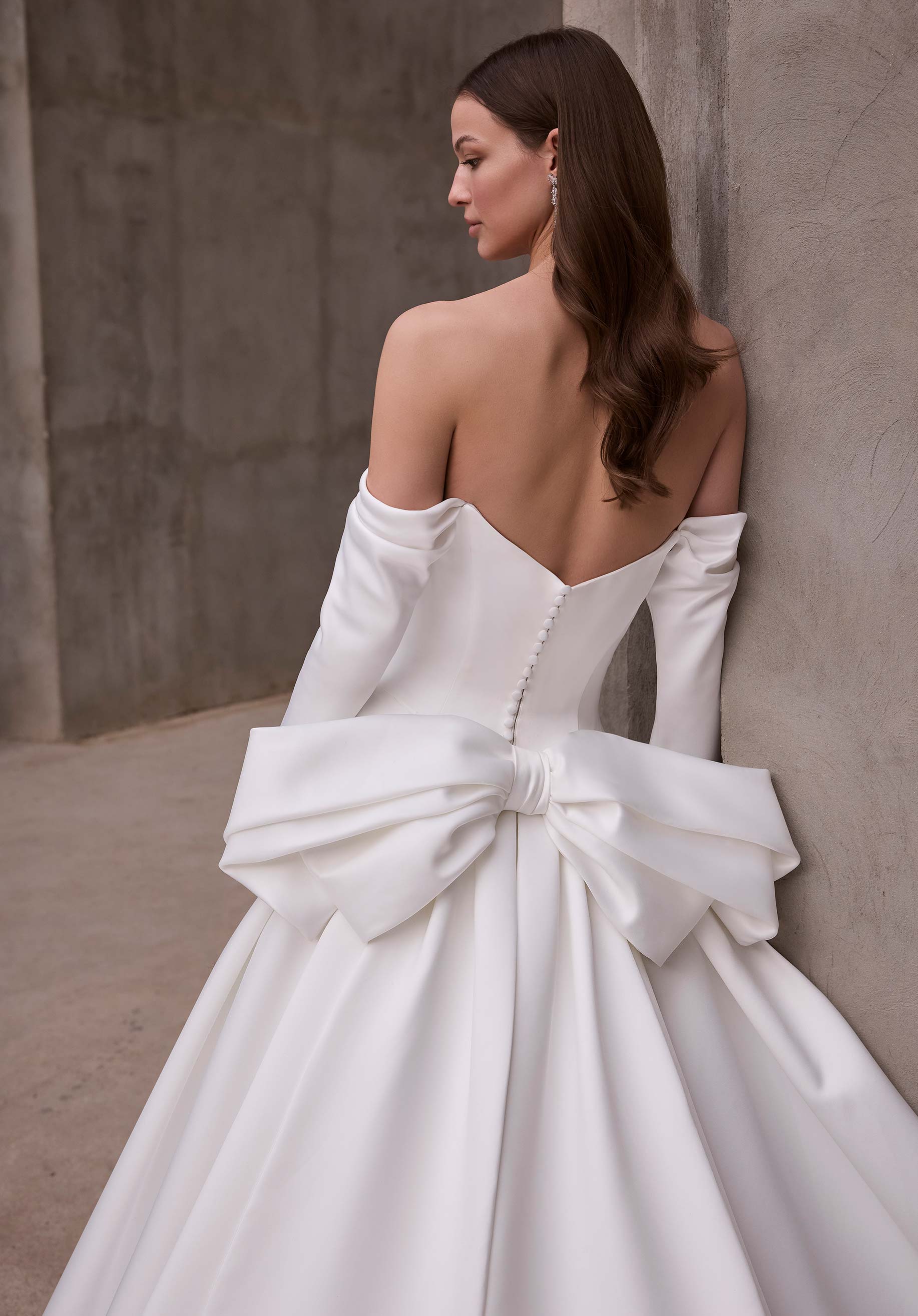 L'abito da sposa in raso duchessa presenta una scollatura a occhio di gatto drappeggiata, maniche lunghe con spalle scoperte e cuciture stile principessa con fiocco in raso staccabile.