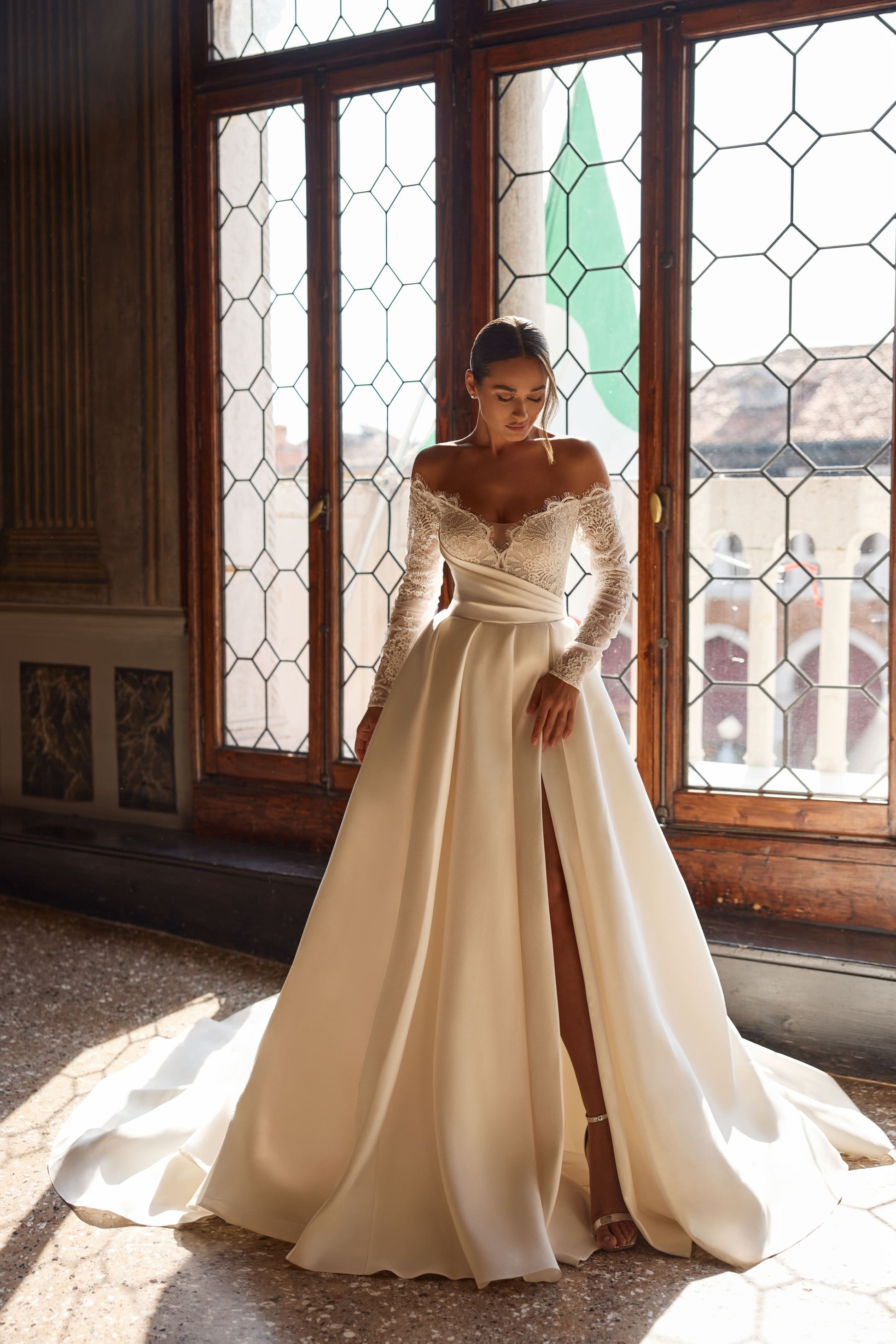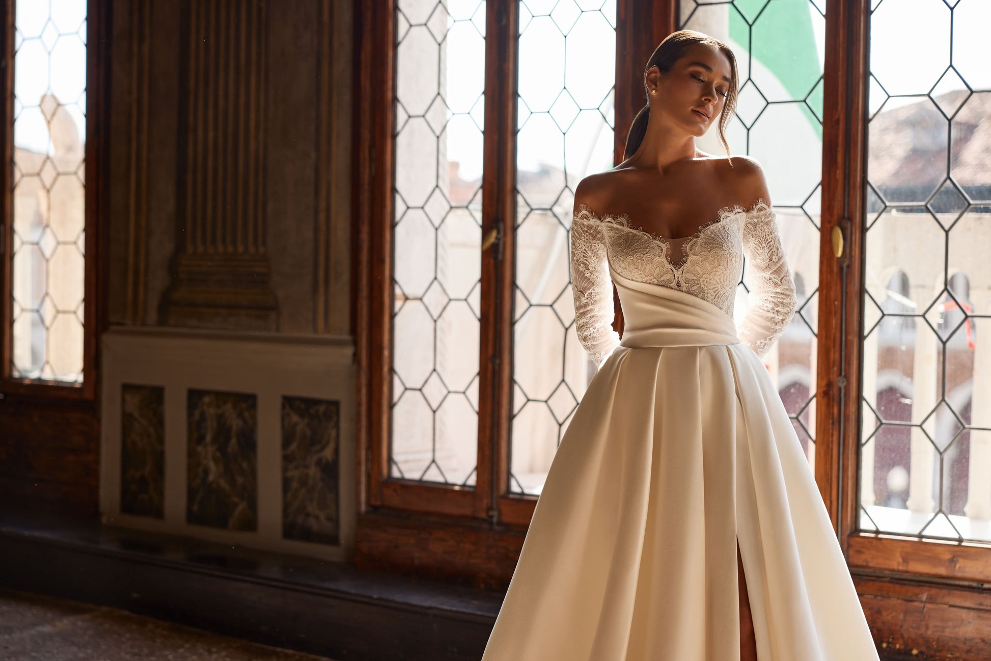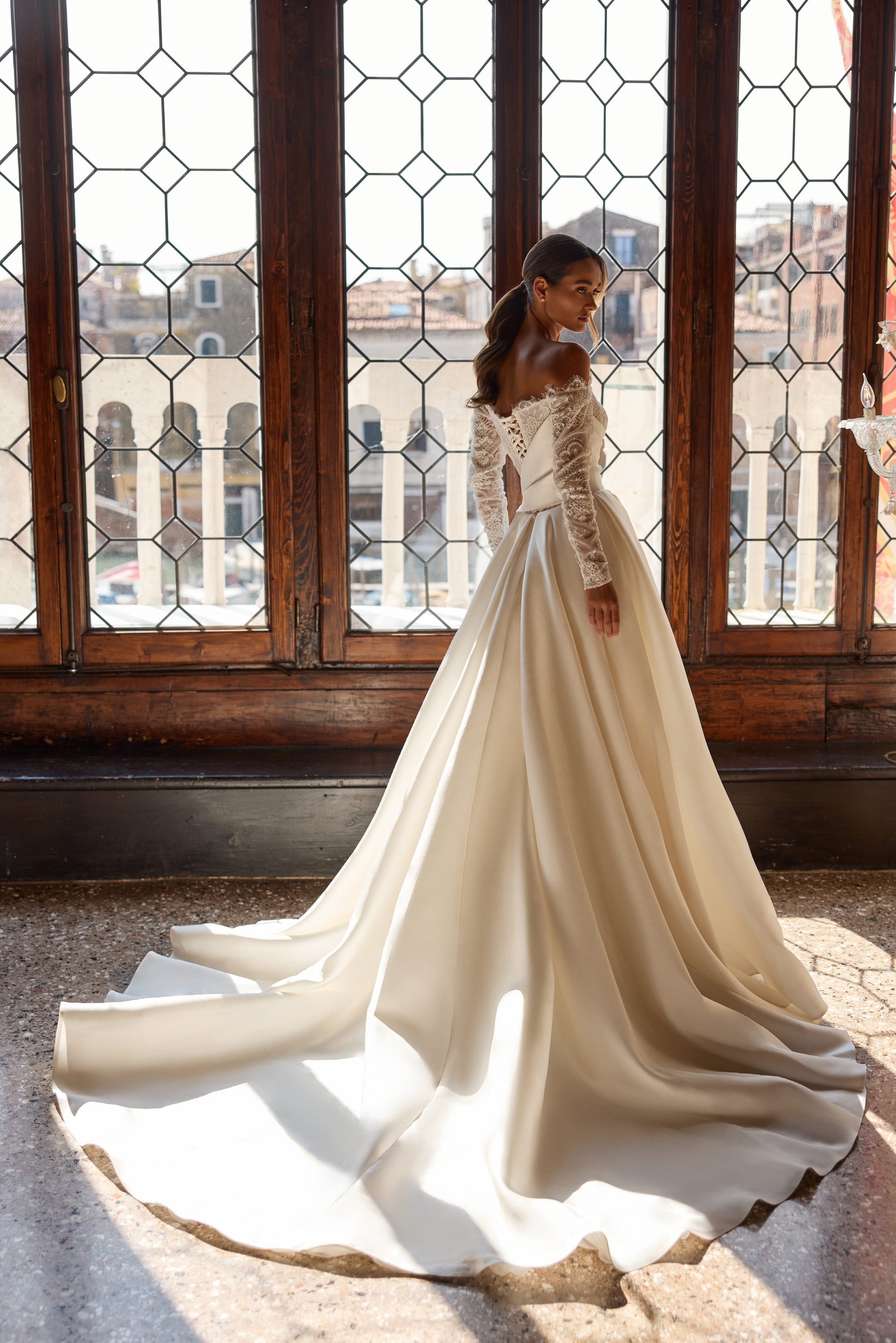 Preziosissimo abito romantico, con gonna in mikado in pura seta ampia e strutturata e corpino in ricercato pizzo francese con maniche lunghe in trasparenza e scollatura a barca.