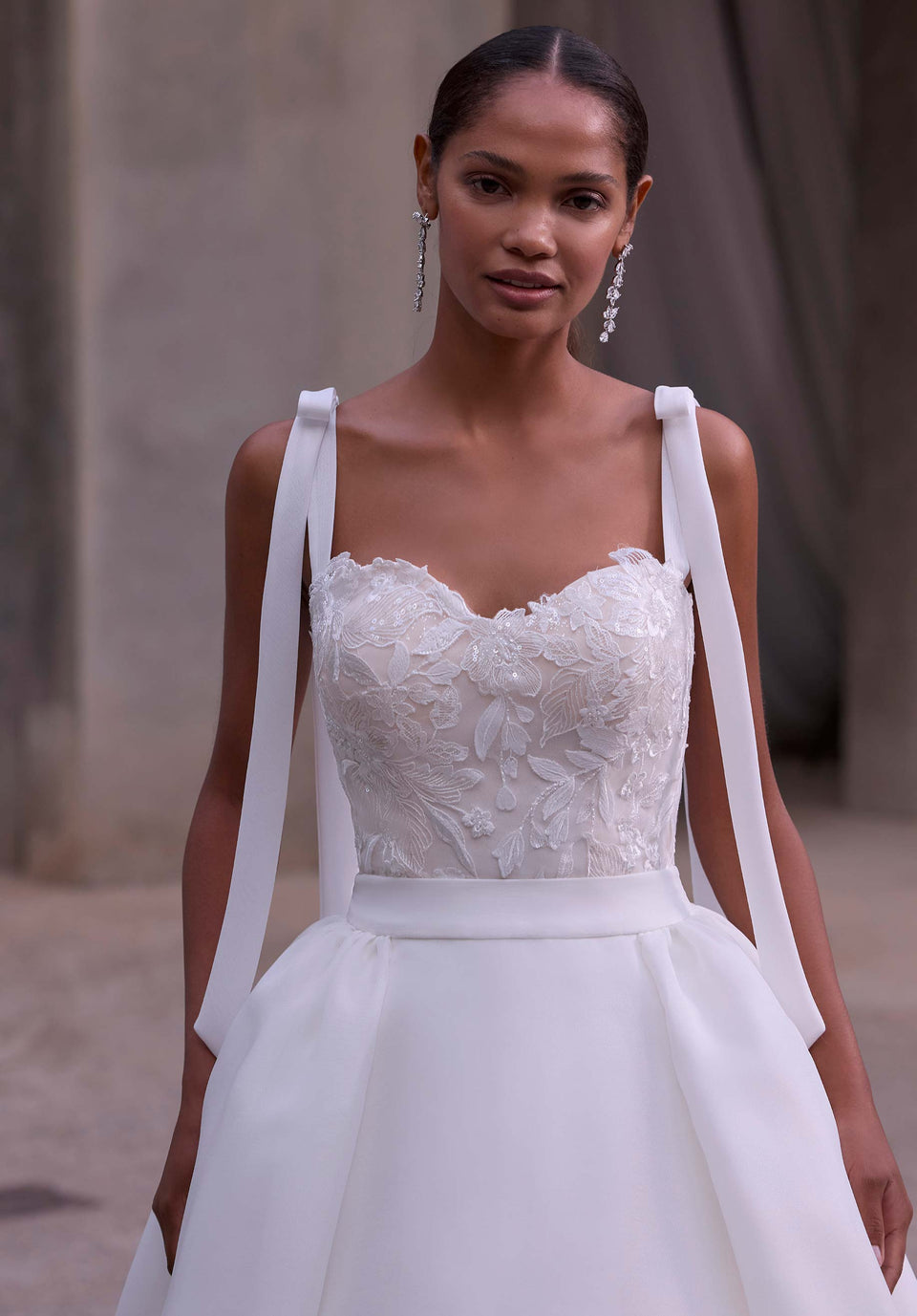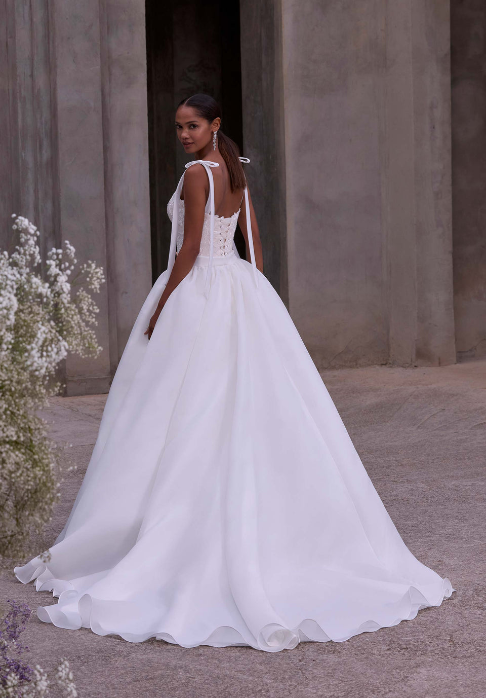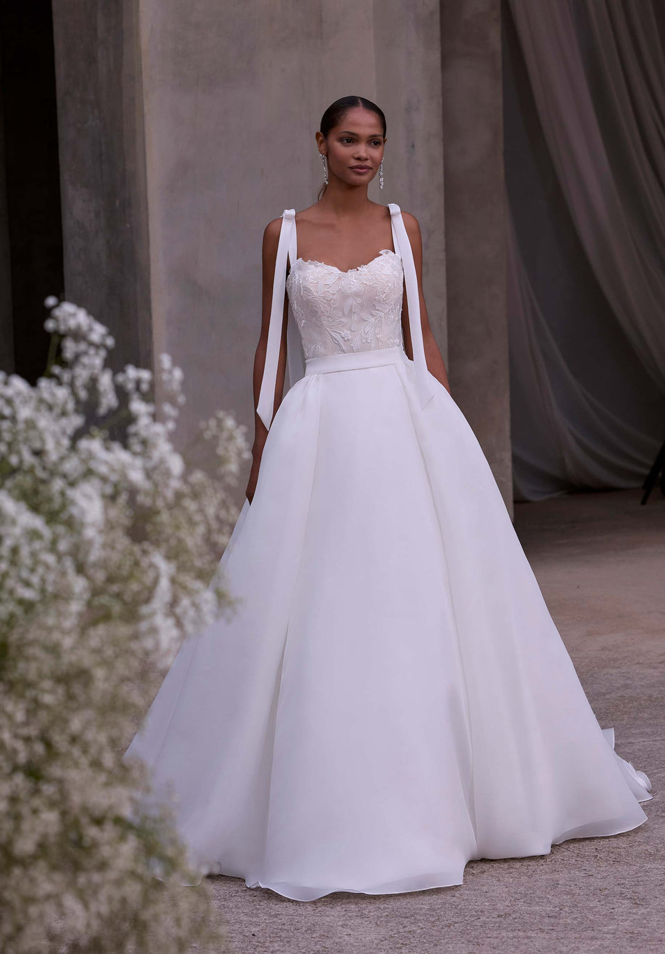 Modello aderente e svasato con applicazioni floreali, scollo a cuore modificato, spalline con fiocco, schiena a corsetto con lacci e sopragonna in organza staccabile con tasche. La sopragonna in organza con tasche è venduta anche separatamente come modello 11611.