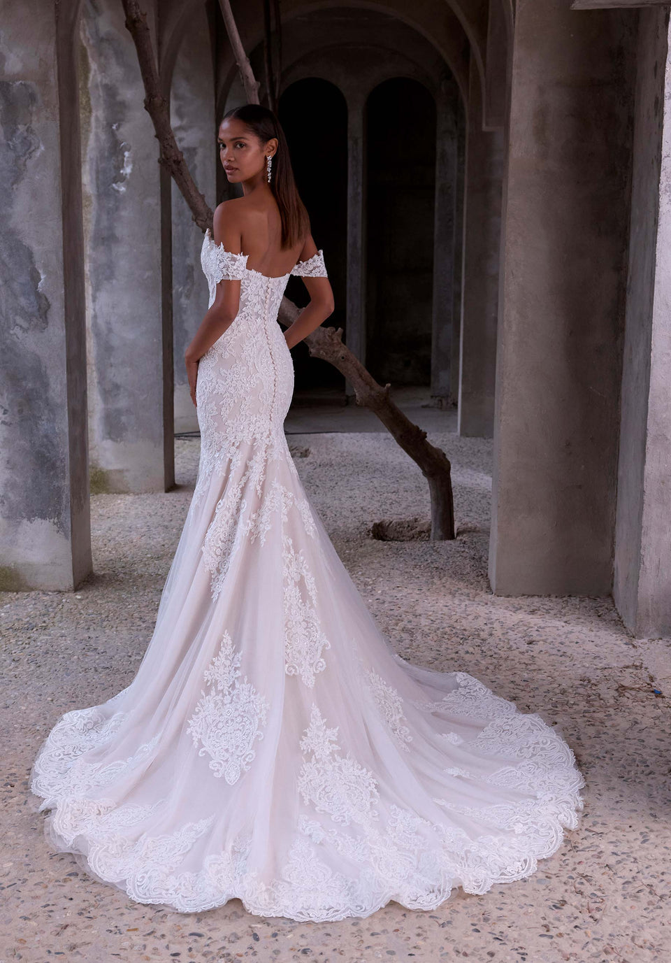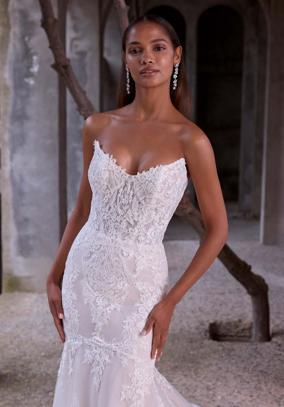 L'abito da sposa a sirena in pizzo cordonato presenta una scollatura a cucchiaio senza spalline e maniche staccabili con spalle scoperte, cuciture a principessa e orlo smerlato.