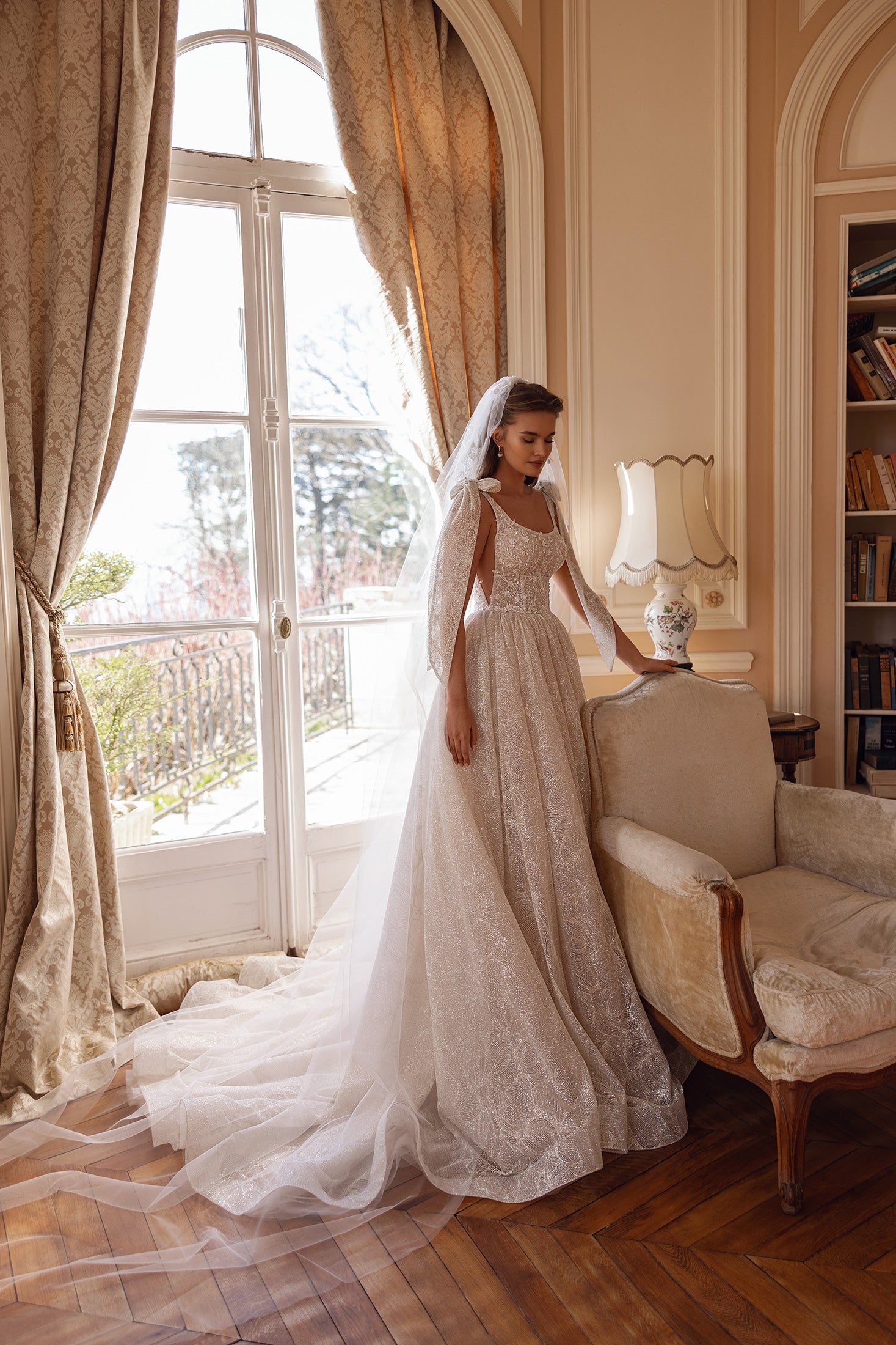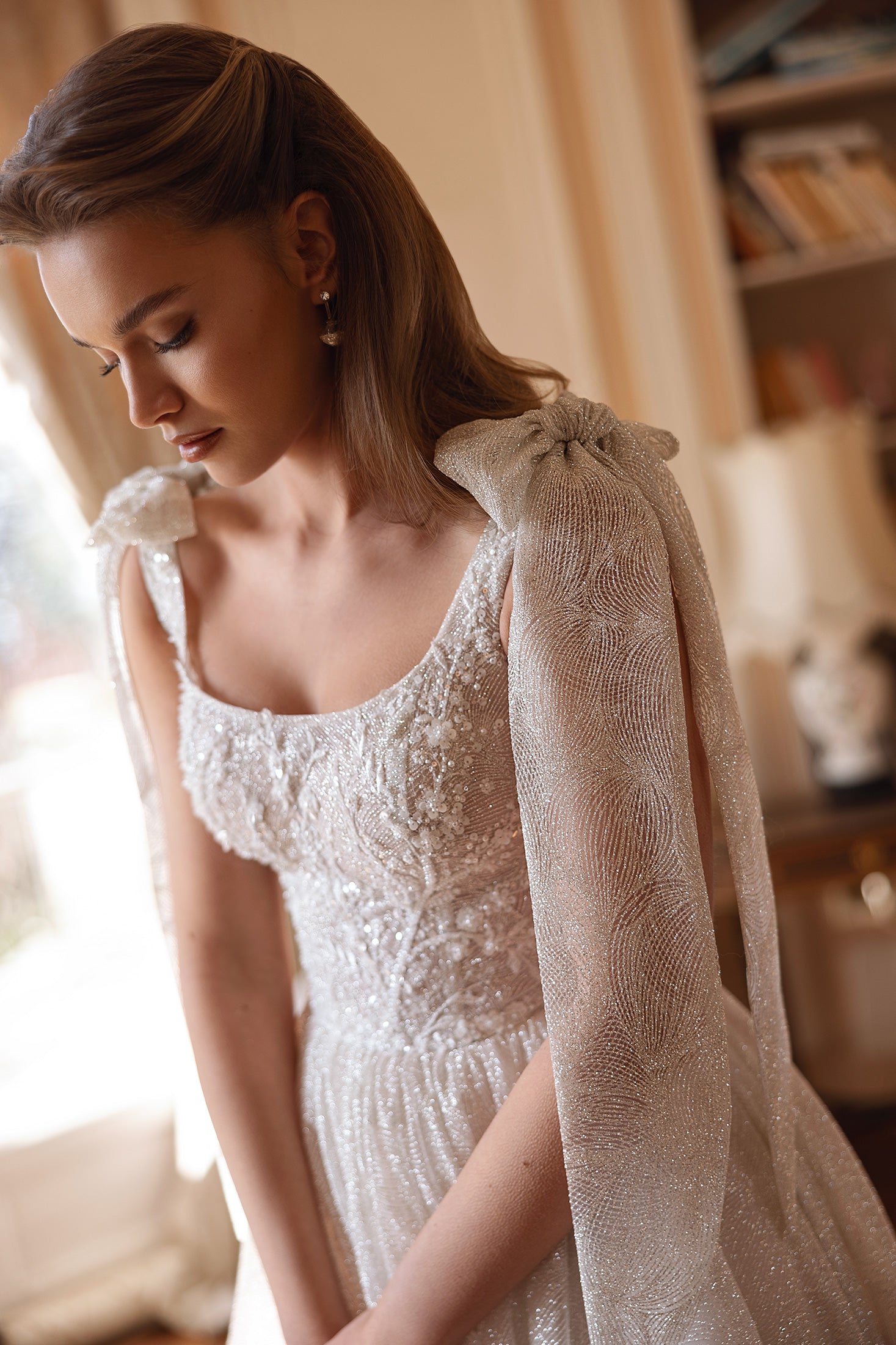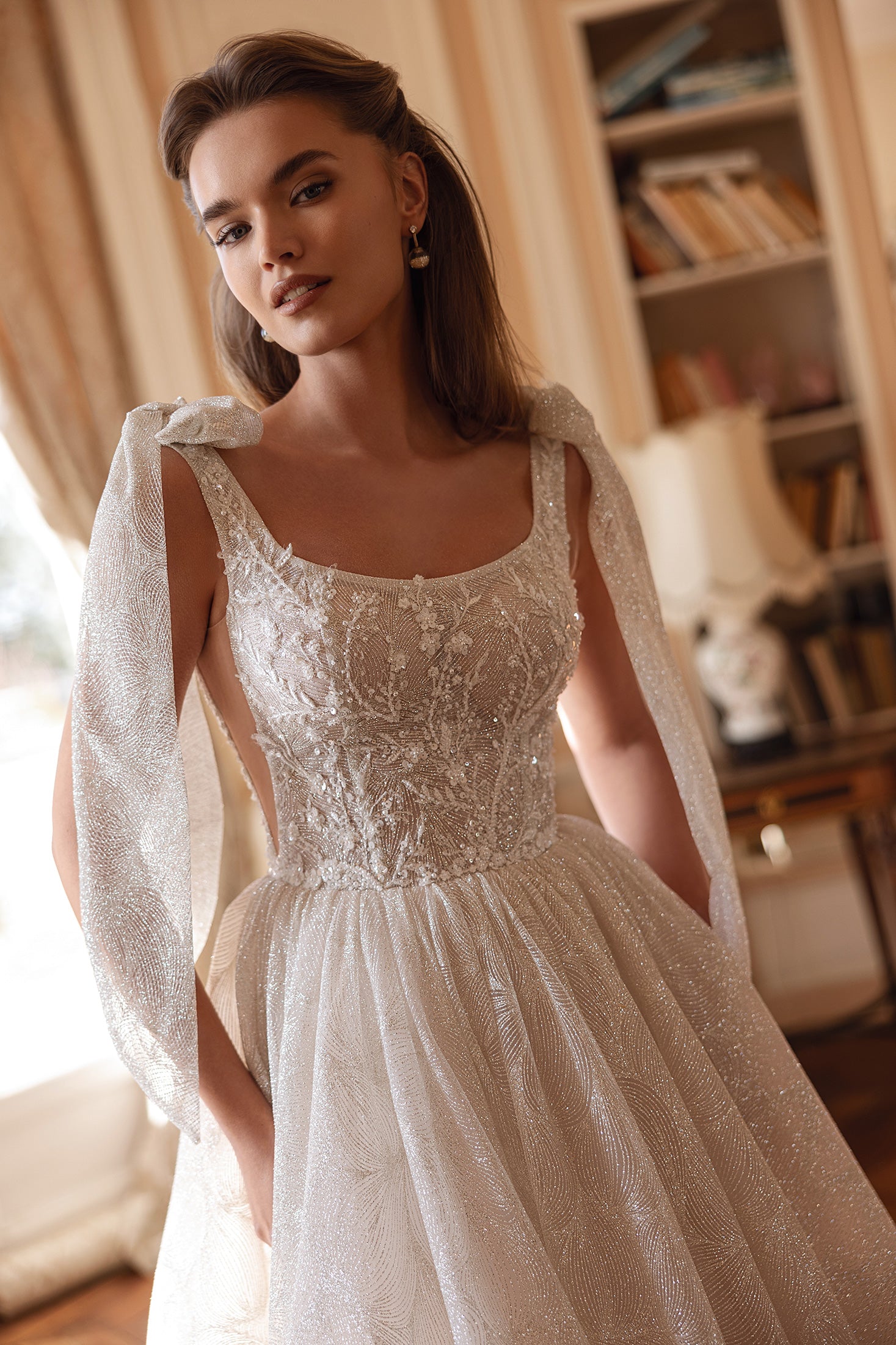 Brilla come una stella nel tuo grande giorno con questo abito di ispirazione celeste. Realizzato in tessuto scintillante con una fantasia incantevole, l'abito cattura la luce a ogni movimento. Il suo corpetto strutturato è decorato con delicate perline e ricami floreali, bilanciando perfettamente glamour e grazia. L'ampia gonna a palloncino si snoda senza sforzo in uno strascico spettacolare, mentre il morbido velo scintillante completa il look magico. I fiocchi staccabili sulle spalle aggiungono un tocco stravagante, cadendo a cascata con un movimento aggraziato. La schiena scollata aggiunge un tocco moderno alla silhouette classica, rendendola indimenticabile da ogni angolazione. Questo è il tipo di abito che trasforma ogni passo in un momento indimenticabile.