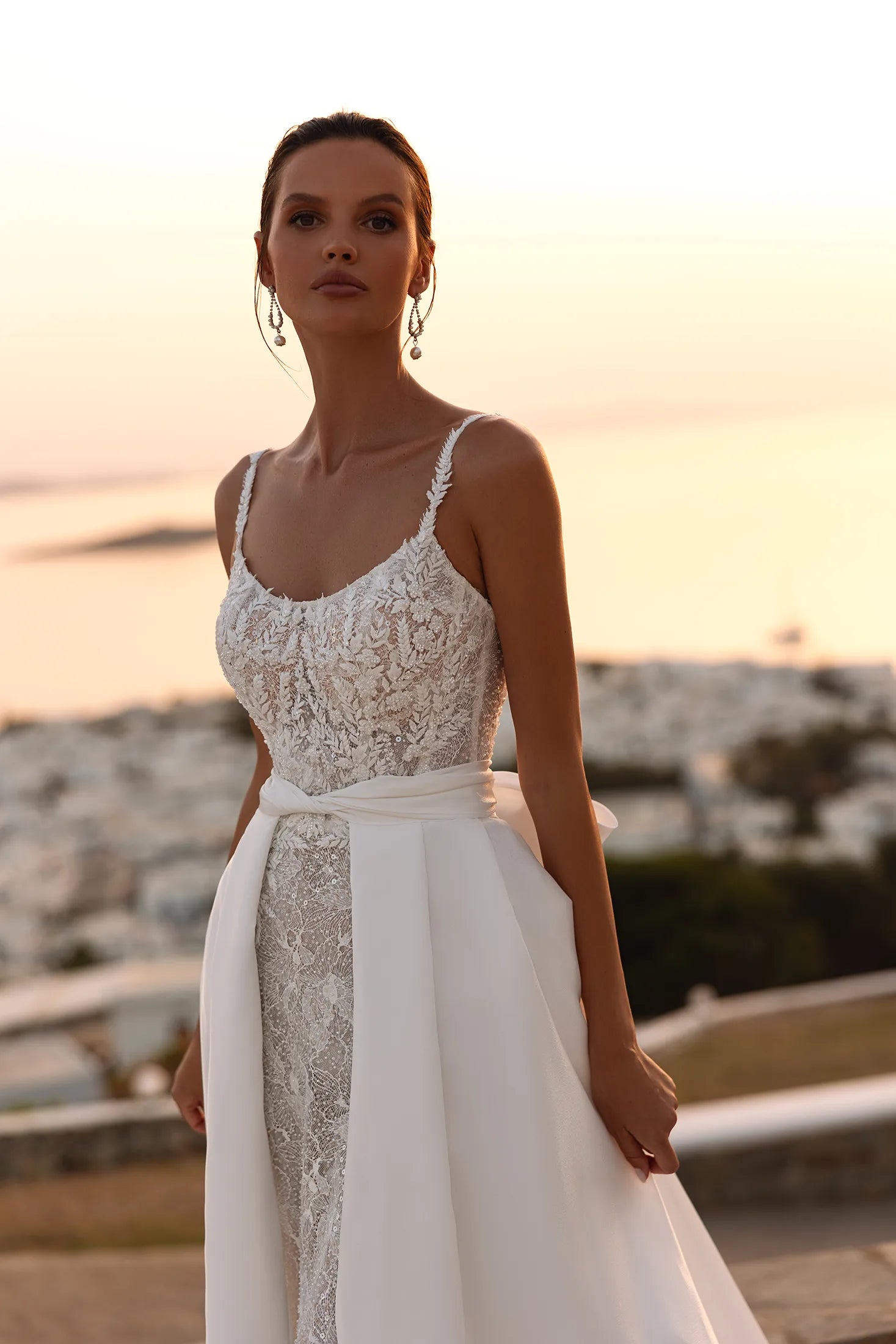 Meg è uno splendido abito da sposa che fonde eleganza e fascino. Confezionato in incantevole pizzo Chantilly impreziosito da perline e paillettes, la sua silhouette aderente crea un effetto delicato e semitrasparente. La scollatura rotonda incornicia con grazia il viso della sposa, mentre applicazioni floreali con perline impreziosiscono il corpetto e i fianchi, aggiungendo dettagli intricati. Sottili spalline in pizzo esaltano le spalle con un tocco romantico. Per una maggiore versatilità e un tocco regale, Meg include uno strascico in mikado staccabile, che offre un'opzione per un secondo look. Completa l'insieme un velo coordinato, che garantisce un look da sposa armonioso e sorprendente, che incarna bellezza e raffinatezza senza tempo.