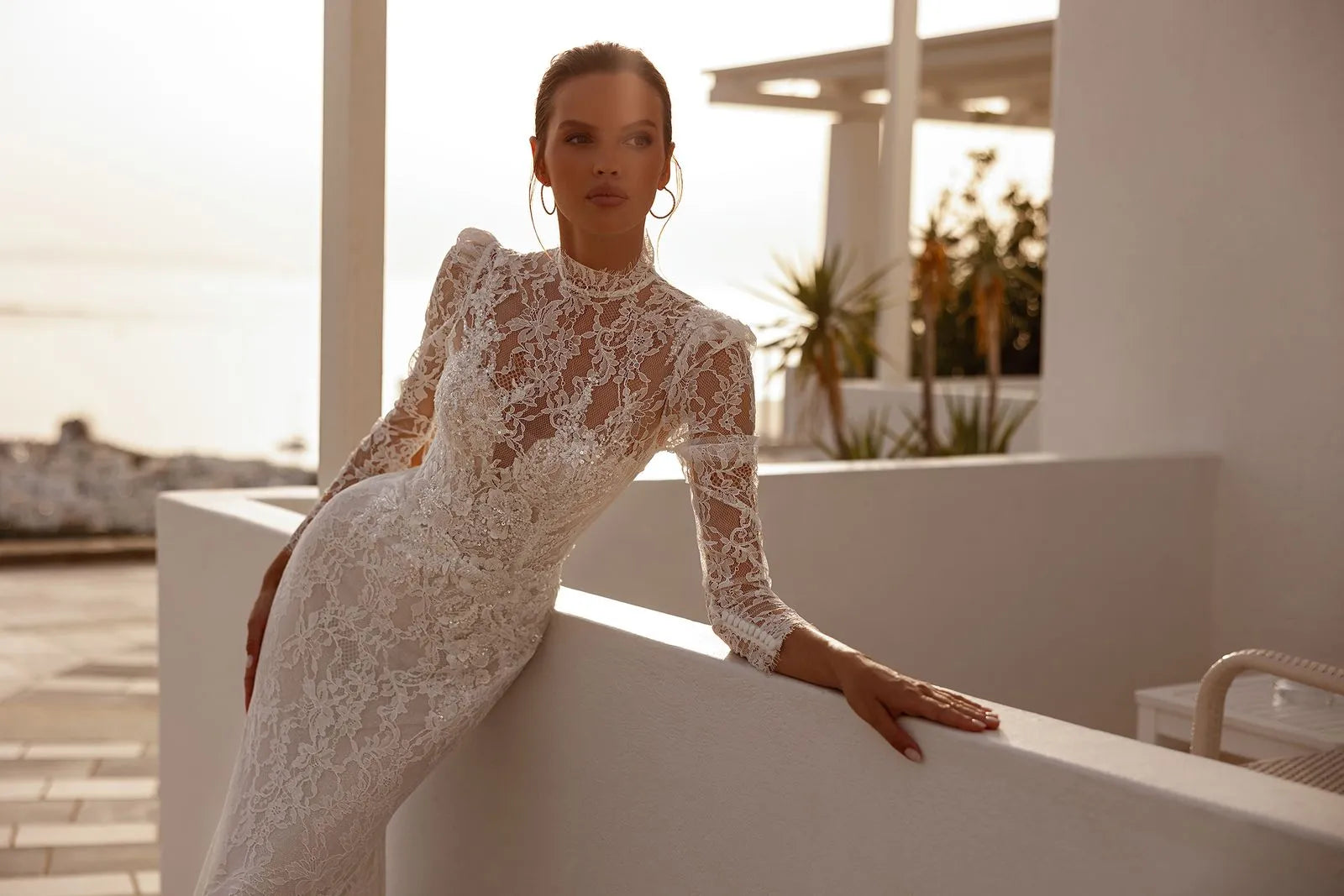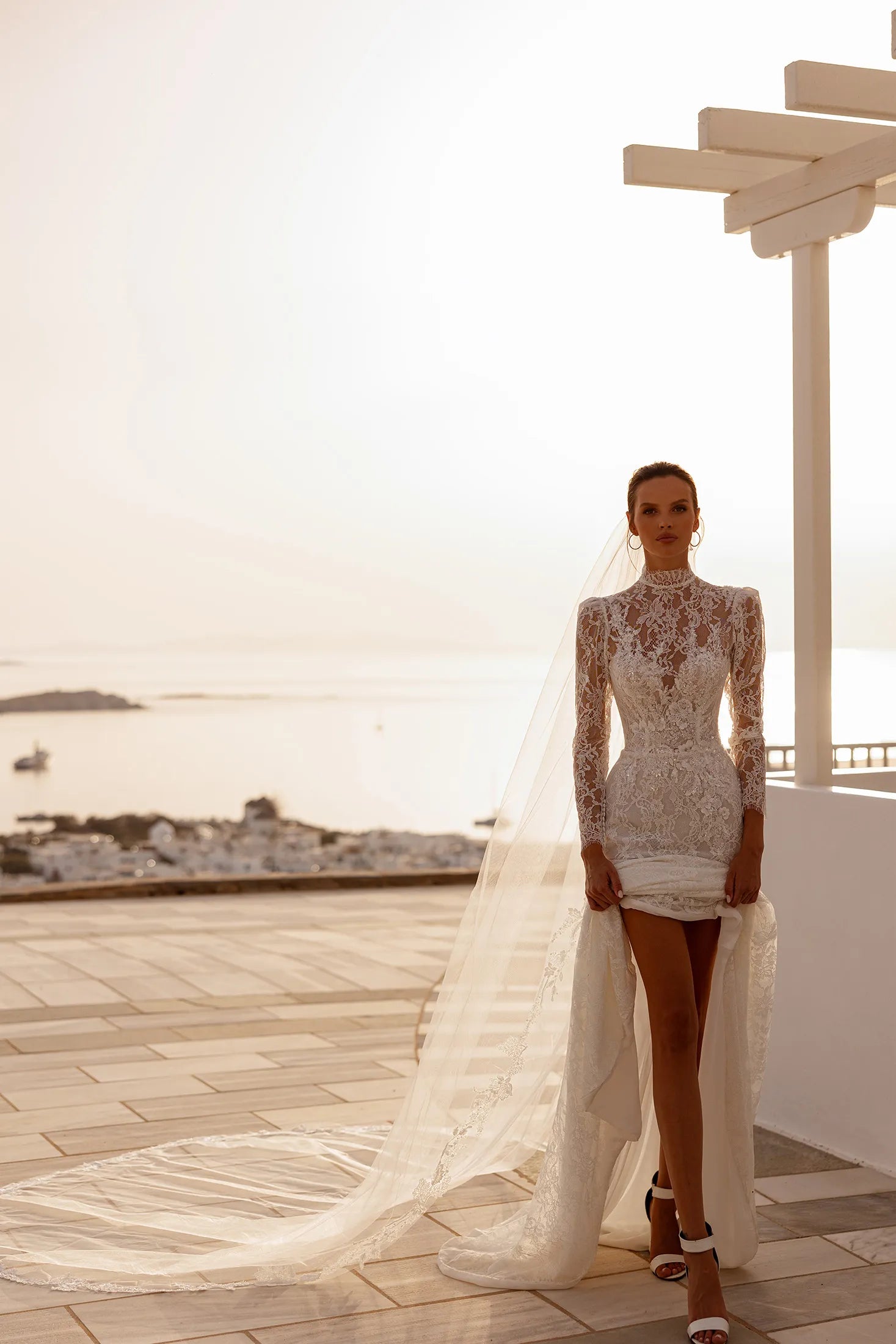 Lo splendido abito da sposa aderente Priya è un capolavoro di eleganza, realizzato in delicato pizzo Chantilly. Presenta una scollatura a V alta e maniche lunghe, con corsetto e gonna foderati in rete glitterata per un tocco di delicata brillantezza. Il corpetto è impreziosito da delicate applicazioni floreali che esaltano la silhouette femminile. La gonna aderente scorre con grazia, abbracciando i fianchi e formando un leggero strascico. Un velo coordinato, anch'esso in pizzo Chantilly con applicazioni floreali, completa il look, aggiungendo un tocco etereo.