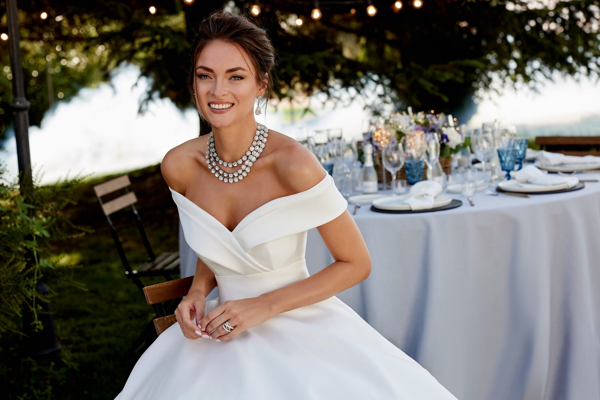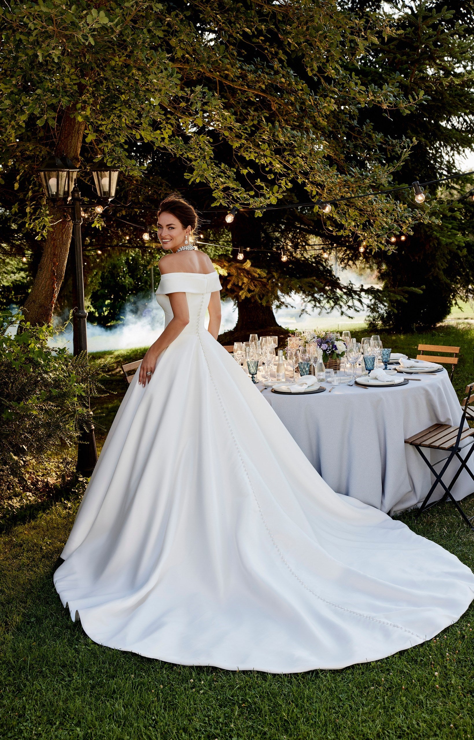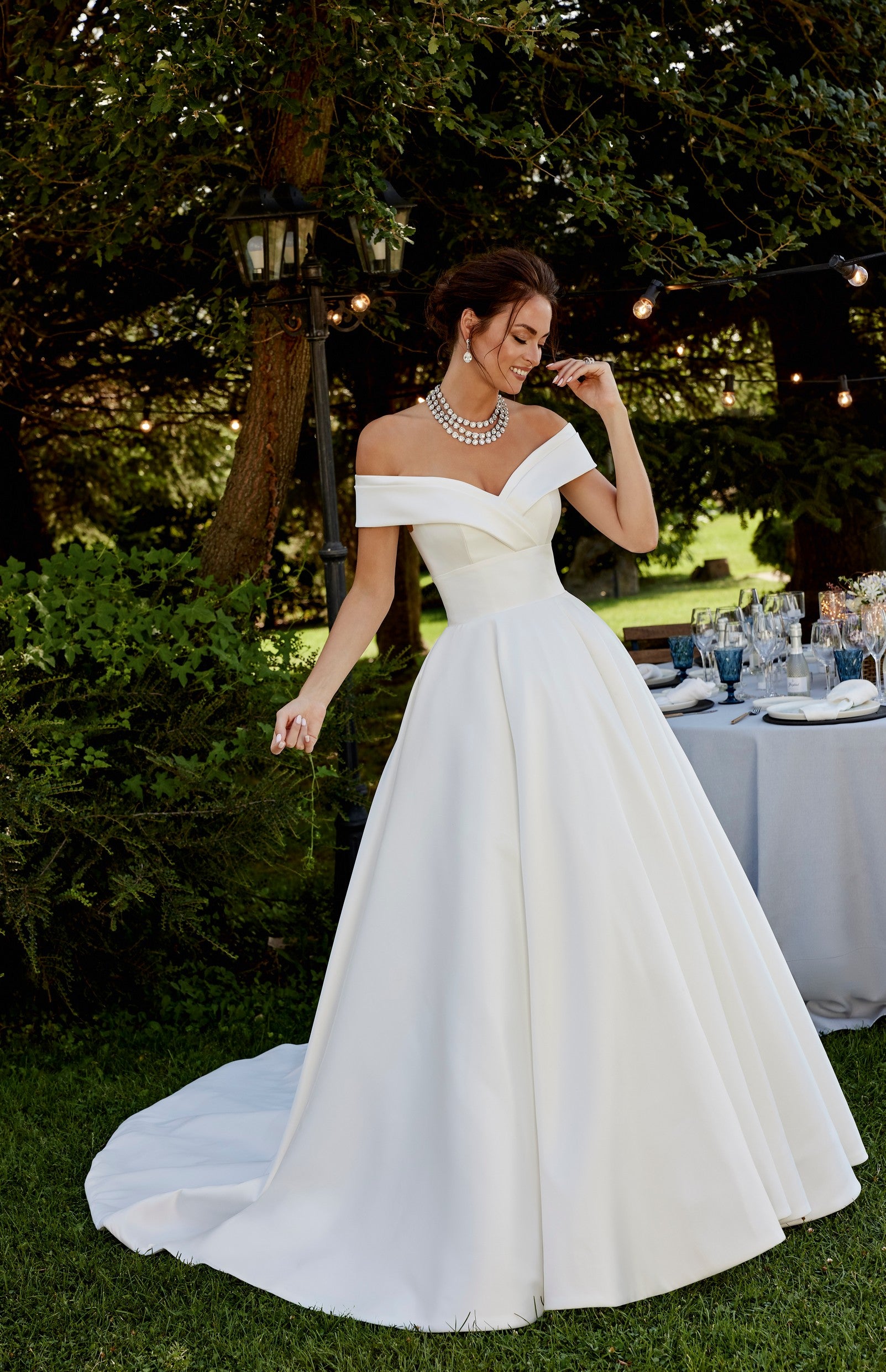 con spalle scoperte è perfetto per una sposa moderna e minimalista.