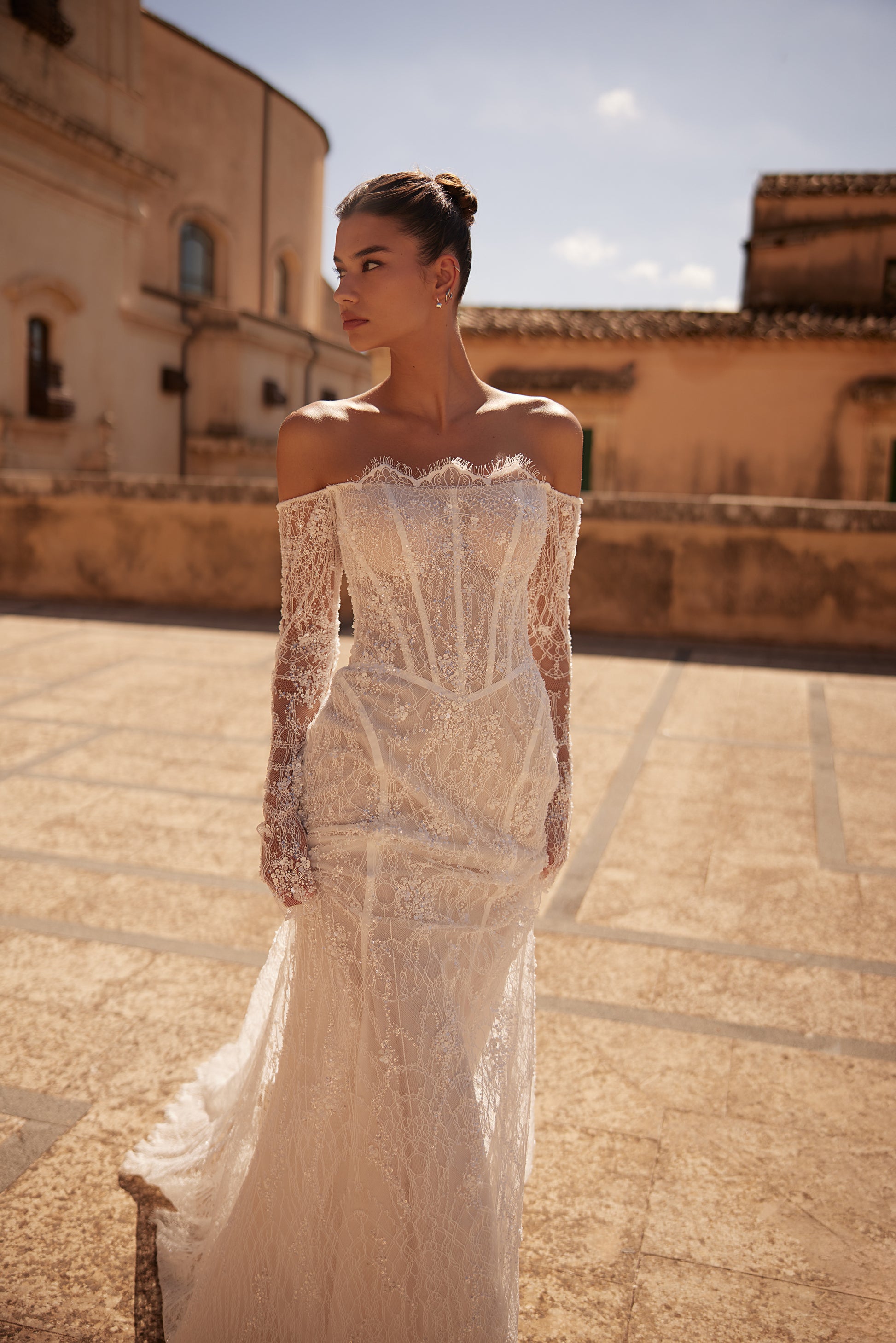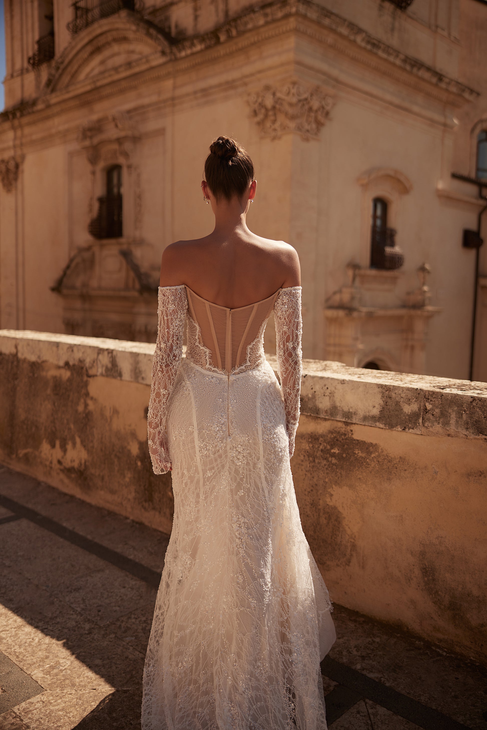 Raffinata sirena in pizzo francese e cristallini Swarovski. Disegnata per esaltare la femminilità ed esaltare l’eleganza di una sposa che vuole sentirsi romantica e moderna. Con il gioco di trasparenze questo abito risulta essere il giusto mix tra contemporaneo e tradizionale!