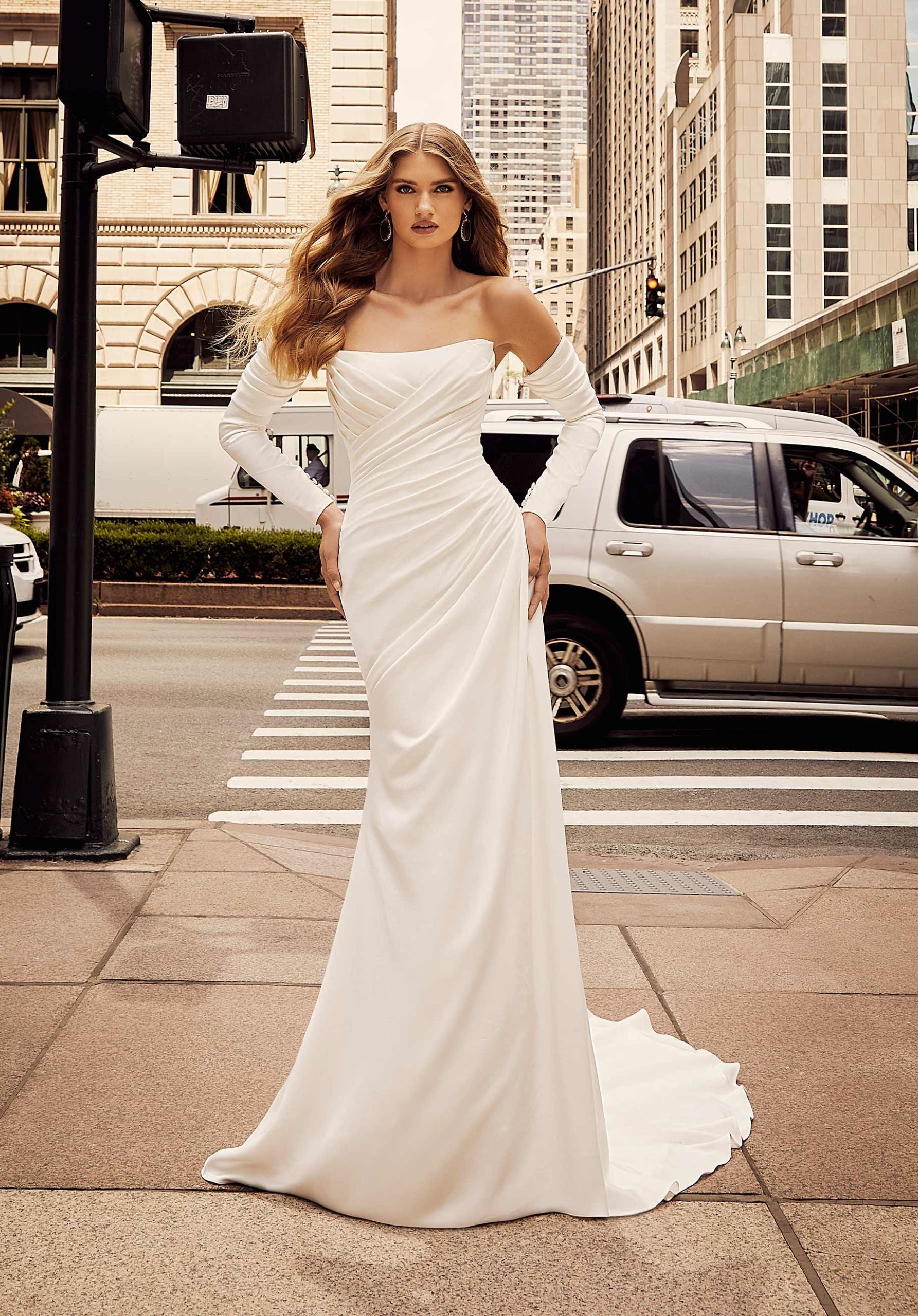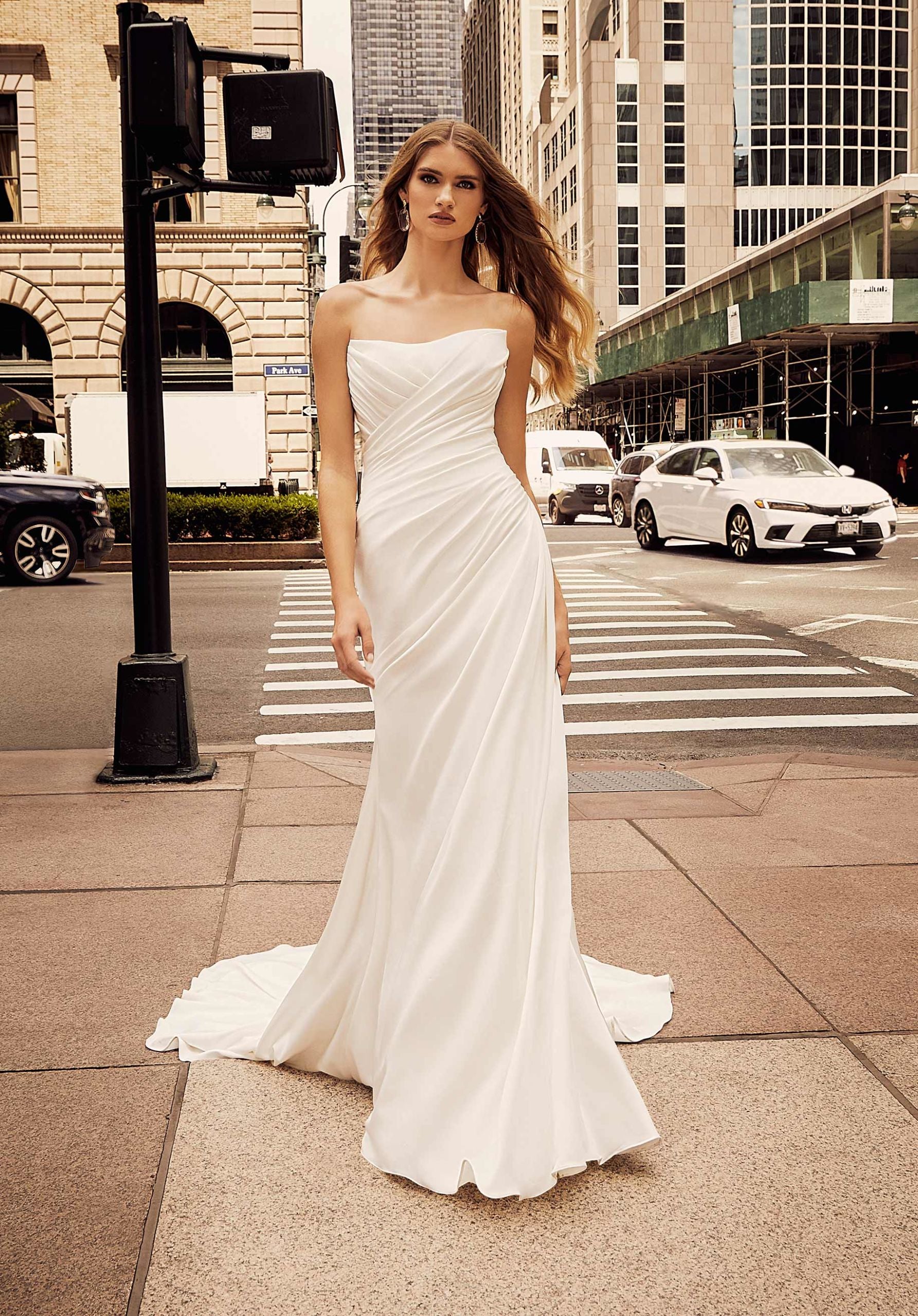 Il raso di lusso eleva l'abito con dettagli come la scollatura dritta